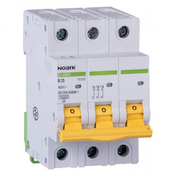 Автоматичні модульні вимикачі серії Ex9BH є універсальними пристроями захисту для всіх типів використання, де потрібні високі стандарти для автоматичних вимикачів промислового застосування відповідно до EN 60898, з номінальним струмом в діапазоні від 1 до 63 A. Відключаюча здатність Icn становить 10 кА. Відключаюча здатність Icn відноситься до всіх автоматичних вимикачів, тобто до номінального струму 63 А та до D характеристики спрацювання. Автоматичні вимикачі серії Ex9BH поставляються в версіях 1, 1 + N, 2, 3, 3+N і 4-х полюсного виконання з шириною полюса відповідного одному модулю (18 мм). Характеристики спрацювання - B, C, D. Серія Ex9BH має кольорові рукоятки, колір рукояток відповідає номінальному струму автоматичного вимикача. Так як пластик рукоятки забарвлений в масі, то рукоятки не можна взаємозаміняти. Автоматичні вимикачі серії Ex9BH можуть бути укомплектовані широким спектром додаткових аксесуарів, а саме: додатковими і сигнальними контактами, незалежними розчеплювачами, розчеплювачами мінімальної напруги, розчеплювачами максимальної напруги, а також додатковими блоками ПЗВ. Є можливість створити різні комбінації аксесуарів. Комбінації обмежені тільки загальною кількістю аксесуарів, а не їх типом - будь-які комбінації можливі. Додатково можна використовувати до 3х додаткових або сигнальних контактних блоків, а також додатково до 2х розчеплювачів.