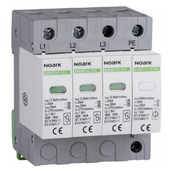 Серія Ex9UE1+2 25 - група пристроїв захисту від імпульсних перенапруг класу I + II. Вони призначені як захист від прямого попадання блискавок середньої інтенсивності у повітряну лінію. У стандартній трифазній мережі TN-C вони забезпечують захист згідно вимогам LPL I, II, викладеним у EN 62305 із загальним струмом блискавки, що вводиться в електричну установку 75 кА і загальний струм блискавки 150 або 200 кА на основі фізичної конфігурації і взаємного положення заземлення точкою громовідводу, точкою заземлення електроустановки та місцем установки SPD. Конструкція Ex9UE1+2 25 – гібридна, що базується на комбінації високоенергетичних металевих оксидних варисторів (MOV) та ізоляції Spark Gap (SG). Ця комбінація забезпечує менший час відгуку завдяки швидкому MOV і SG в порівнянні з низькою напругою до чистого розчину SG. Послідовне підключення MOV забезпечує не тільки обмеження характеристик струму для SG, але також повну ізоляцію через послідовне підключення SG до MOV. Основні характеристики визначаються переважно частиною MOV. Отриманий рівень захисту і характеристики реагування не тільки виконують вимоги SPD класу I, але й для класу II. Ex9UE1+2 25 забезпечує захист для обох класів I і II. Модульна конструкція зі змінними модулями захисту дозволяє легко і швидко замінити модуль у випадку спрацювання MOV або якщо його термін служби вичерпано через високу інтенсивність або часте виникнення піків перенапруги.